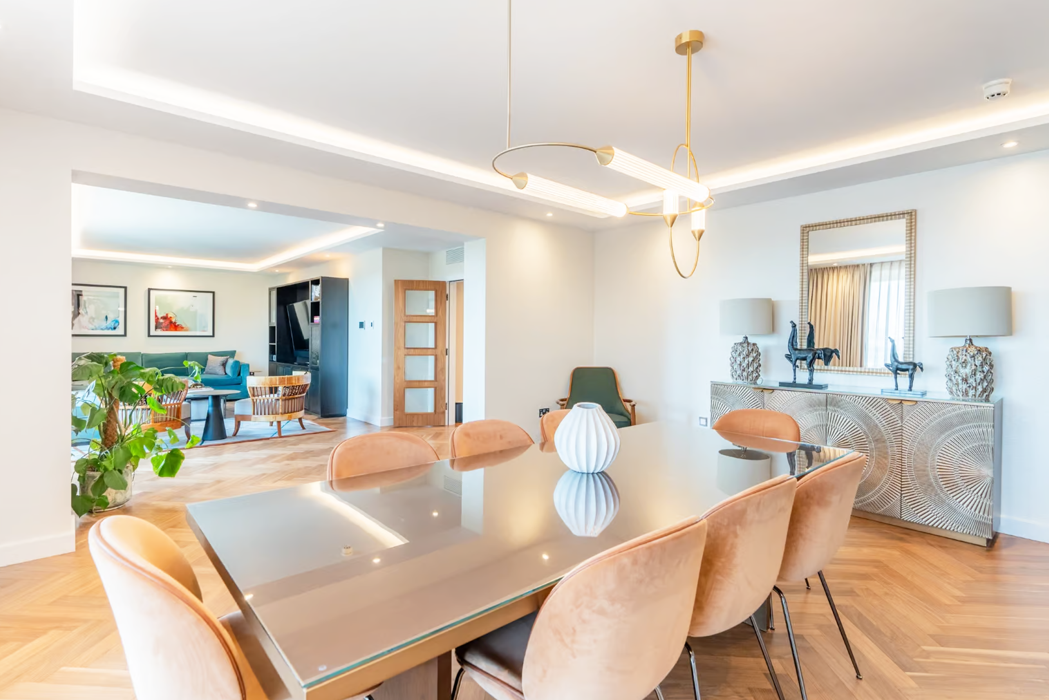 This stunning penthouse offers an expansive open-concept living area filled with natural light and serene treetop views. The reception and dining spaces, adorned with traditional parquet flooring, open onto two private balconies. The modern kitchen is fully equipped with premium Miele appliances and features a Nespresso machine for added convenience. The property boasts four spacious en-suite bedrooms, each with floor-to-ceiling windows and built-in wardrobes, providing both elegance and practicality. Additional features include a dedicated office space and a guest powder room.
